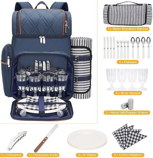 With one waterproof blanket, 4 x flatware,4 x wine glasses, 2 metal salt/pepper shakers, 1 cork screw,1 cheese knife, 4 x 9” plates,4 x cotton napkins